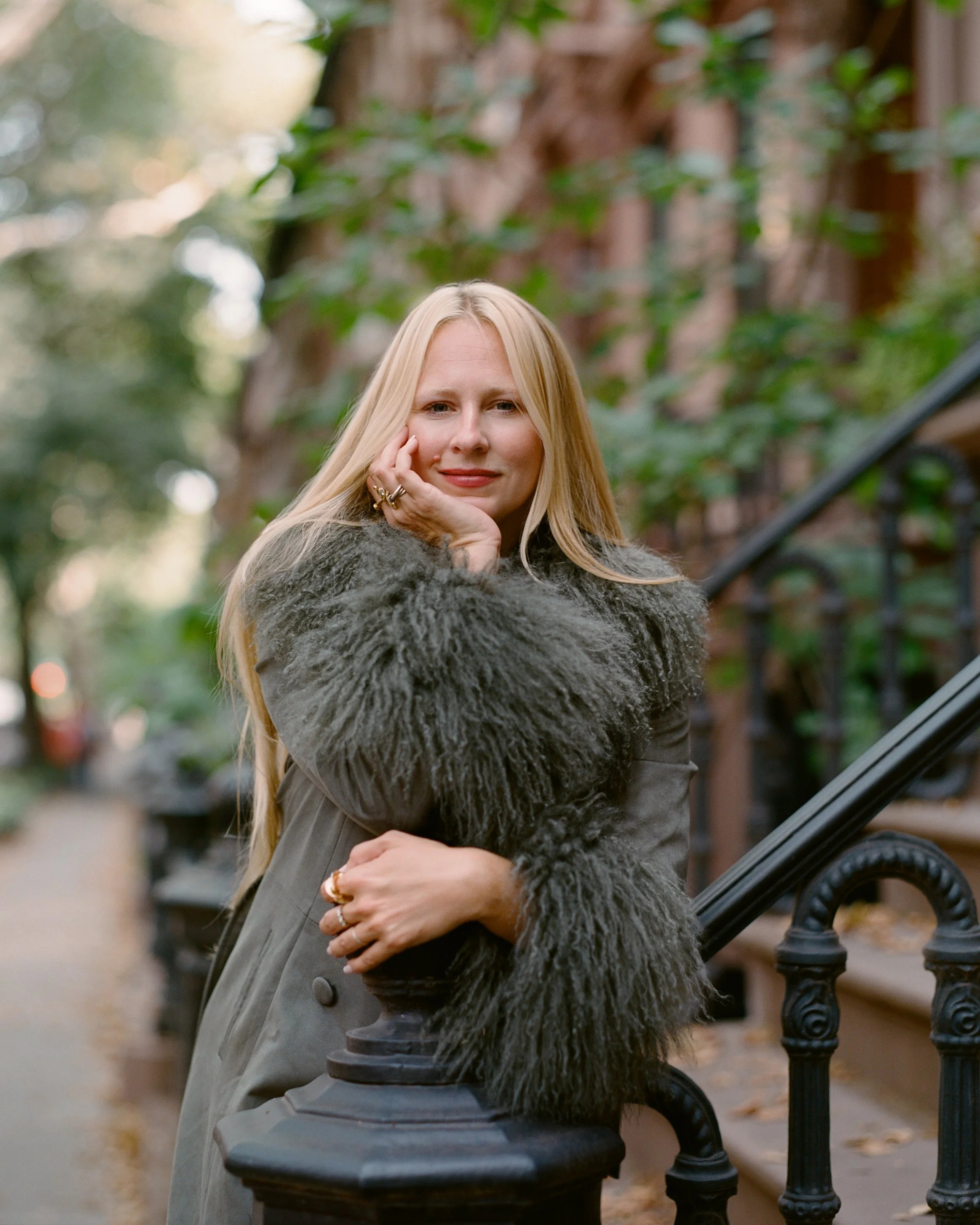 A woman with long blonde hair wearing a gray coat with a fur collar, standing outdoors on a city sidewalk with stairs and brick buildings in the background.