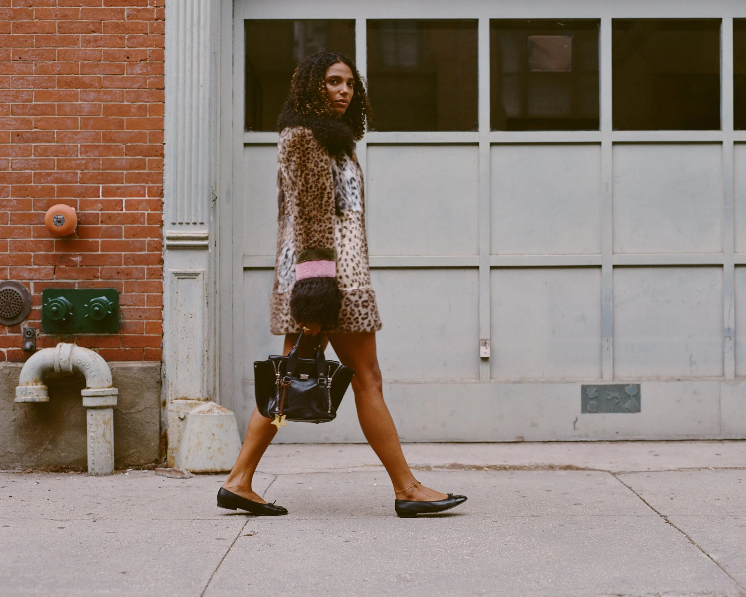 A woman walks on a city sidewalk in front of a garage with a grey door, wearing a leopard print coat, black flats, and carrying a black handbag.